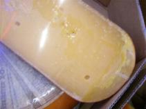 | それは、まず表のラベルや裏に貼ってあるより詳細なレベルを見ることです。チーズ名、原材料、添加物、重量、製造者名、製造者番号(CEE)、住所、消費期限などについて調べます。このチーズの場合、着色料と保存料が使われています。しかし、このうちの着色料は、オールドミモレットでも使われている植物の種を由来にしたアナトーというオレンジ色なので問題はないと判断しました。あとは、日本で使用が禁止されているものが入っていないかどうかも注意して調べます。 |