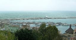 | 2月19(月)、昼食が終わったのは夕方4時でした。それからロベルトさんが車でシャッカの郊外にあるアグリツーリズモの宿舎に連れて行ってくれました。明日までやっているカーニヴァルをこれから少し見に行くことにしました。下の写真はシャッカの港の様子です。旧市街地は港から陸に向かって階段状に高くなりながら続いています。港から少し上がった高台の公園からこの写真を撮りました。 |