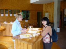 | 見学を終えると下の写真のような広い部屋に入りました。ここでは、このチーズ工場で作っている全てのチーズの特徴と実物が展示されてします。そして、その全てのチーズは、試食も出来るように用意されています。気に入ったチーズがあれば、その場で買うこともできます。私たちの後からは、観光で来た年配の団体さんがやってきました。その後には、若者のグループを乗せたバスも到着しました。観光客も積極的に見学を受け入れているようです。 |