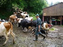 | 搾乳が終わると上の写真の様に牛舎の扉を開きます。すると牛は待ってましたとばかり外に出てきます。そして明日の朝まで放牧させるのです。ケンプさんのところは標高が高いので、冬は雪も積もります。放牧は夏を中心に3、4ヶ月行なわれるということでした。牛は勝手を知っているのかどんどん上の方に上がっていきます。急な斜面も苦はないようです。意外と俊敏ですし、足腰もしっかりしているようで崖のような場所にある草も食べていました。 |