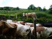 | ケンプさんのところでは、搾乳が出来る牛が20頭ほどだということです。取れるミルクの量は、一頭当たり2度の搾乳で約14リットル。20頭では合計で280リットルほどです。マンスーテルが出来るのはその約1/10の以下なので、25kg前後だと思われます。20頭で家族5人が生活できるとは、フランスとは素晴らしい国だなぁと思いました。牛も人も広々とした環境で生活していけるのですから・・・。 |