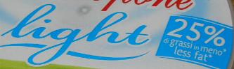 | 上の写真で左が普通のマスカルポーネ、右が低脂肪のマスカルポーネです。右の写真をみると通常のものよりも、25%ほど乳脂肪分が低くなっていると表示されているのが見えます。(下に拡大した写真があります。)良質なクリームを主原料にしたマスカルポーネなのに、その主成分である乳脂肪分を低くしまって果たしておいしさそのままなんて、一時でも信じた自分を恥じました。それだけでも、おかしな話だと気が付けなかった自分が恥ずかしいです。これはもうおいしいものを作るメーカーの使命を逸脱して、明らかに消費者を意識して開発されたチーズです。 |