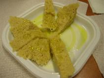 | まず、上の左の写真は、パンにオリーブオイルをかけたものです。テーブルに置いた瞬間から畳の様な若い草の香りがしてきました。早速食べました。うーん、役得です。今年も収穫の季節を狙って来た甲斐がありました。いつ食べてもノヴェッロのオリーブオイルは、格別な味わいです。オリーブオイルは、オリーブ果汁だということがよく分かります。また、右側の写真はドリアーナさん特製のパニーニです。余りに美味しいので、作り方を聞きました。材料が揃えば、札幌でも出来るので帰国したら、作りたいと思います。 |